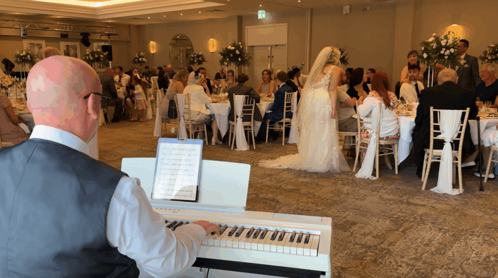 That in-between period — between the wedding breakfast and the start of the evening reception — while you slip away for a few moments, often becomes one of the highlights of the day, as guests gather around the piano, request songs, and the room begins to come alive.